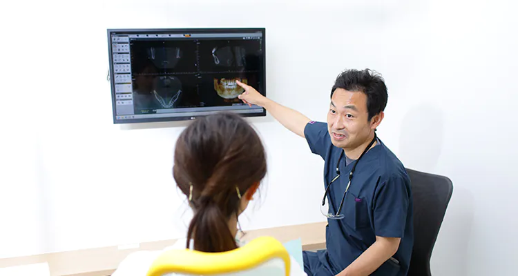 皆様のお口のお悩みをしっかり聞いてカウンセリングを行います。そのうえで的確な検査を行い、分かりやすく画像や説明ツールを用いて説明を行い、ご納得いただきましたら治療を始めています。