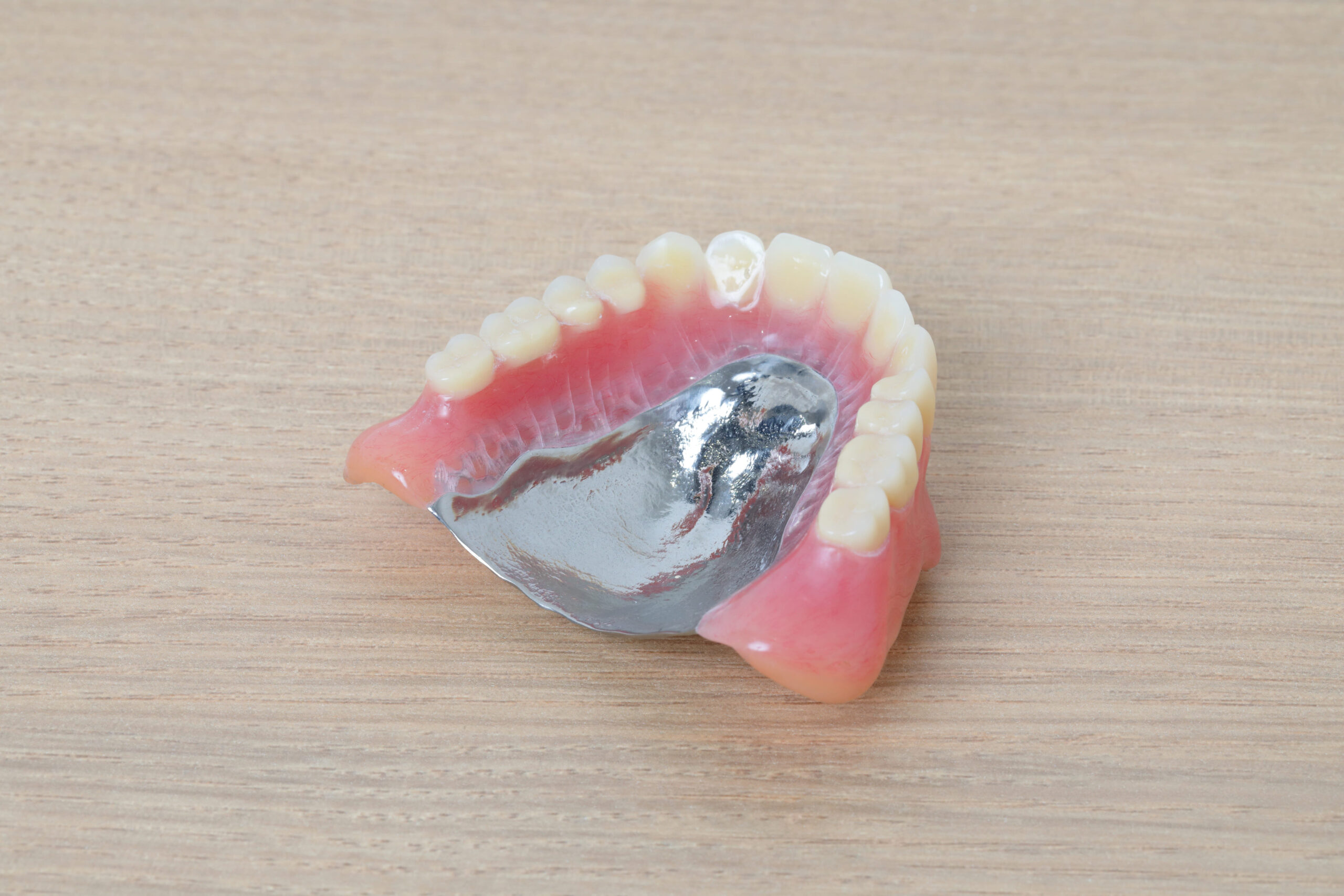 チタン合金やコバルトクロム合金で作った土台を使用します。金属は熱伝導性と強度に優れているため、軽くて薄く、食べ物の温度を感じやすいというメリットがあります。快適に使えて食事の楽しみも失われにくいため、多くの方が使用しています。
